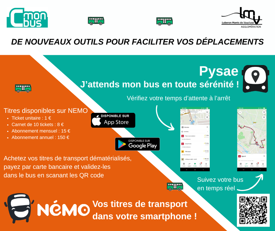 Dans cette démarche, nous nous associons à Pysae et NéMO de Monkey Factory, deux solutions innovantes qui facilitent les déplacements au quotidien sur le réseau de transport de Cavaillon, CmonBus :